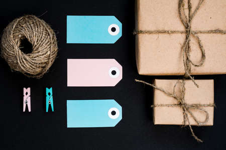 Handcrafted gift boxes wrapped in Craft paper with blue and pink paper card tag, rope and wooden clothespins for decoration.