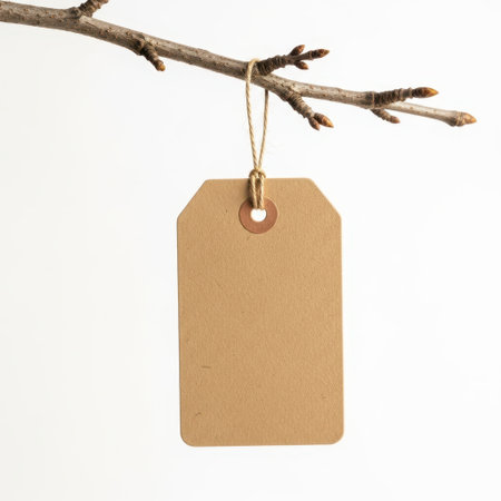 A blank kraft tag hanging on a pine tree branch, perfect for labeling gifts or adding a rustic touch to decorations, set against a vibrant green backdrop.