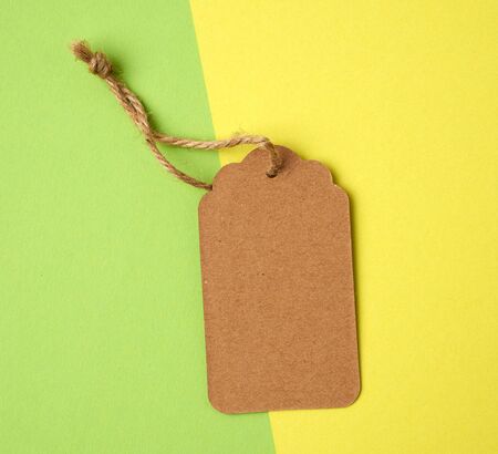 empty paper brown rectangular price tag on a rope on a colored bright background
