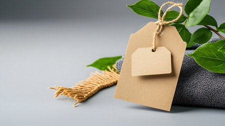 AI Generated. Blank Kraft Paper Tag With Rustic String Loop on Textured Fabric Background