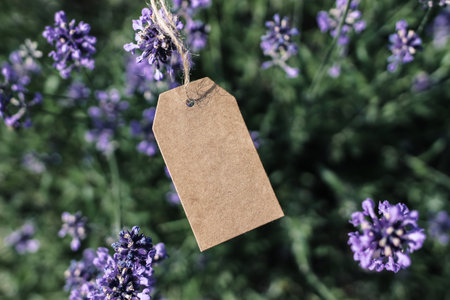 Hanging craft paper gift tag, label mockup with rope. Blurred blooming violet lavender flowers in the garden. Summer sale, branding concept. Fragrant Mediterranean herbs. Selective focus.