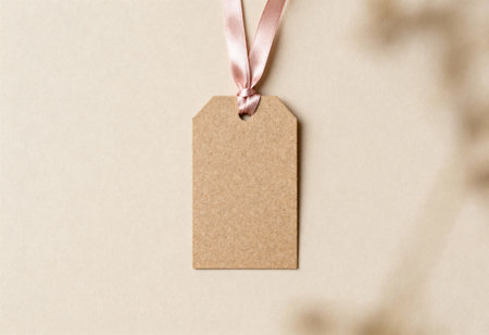 Blank kraft paper gift tag with pink satin ribbon on beige background, ideal for personalized messages and elegant presentations.