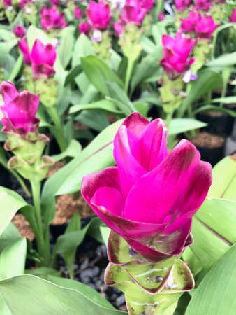 Deep Pink Siam Tulip on the Nursery plants. Curcuma alismatifolia or summer tulip is a tropical plant native to Laos, northern Thailand, and Cambodia.