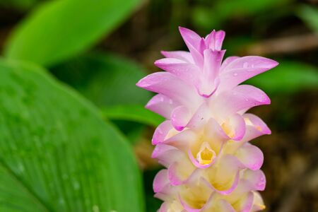 Close up landscape beautiful pink flowers of Siam Tulip or Krachiew flowers green leaf , Bangkok Thailand