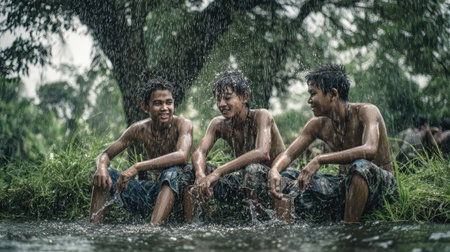 People gather in a serene rural setting, exchanging clay pots filled with water. Vibrant clothing reflects cultural heritage as they engage joyfully in a time-honored festival.