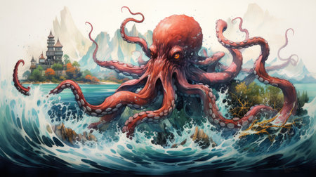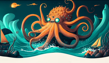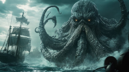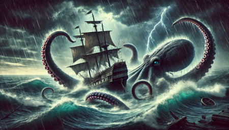 An aquatic sea monster with long tentacles, rising from the ocean's depths in a stormy scene. Ideal for adventure and fantasy projects.