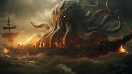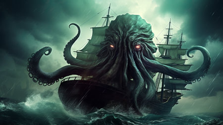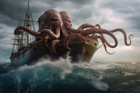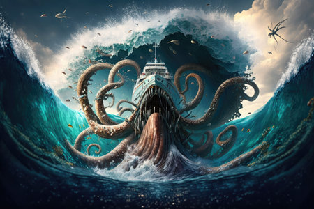 a sea monster sinking a ship with its giant tentacles, waves crashing around it., created with generative ai