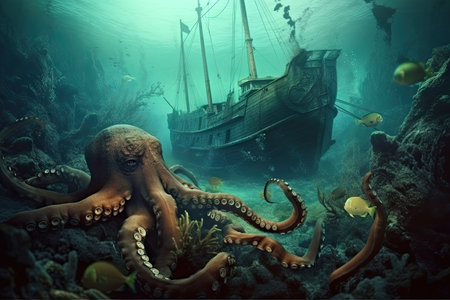 underwater scene, with octopus kraken monster lurking near sunken ship, created with generative ai