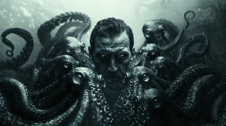A dark and moody illustration featuring a man enveloped by swirling octopus tentacles, evoking themes of power and entrapment.