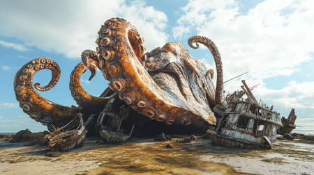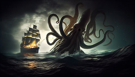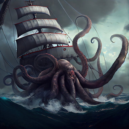 a sea monster with tentacles wrapping around a ship and pulling it into the water, created with generative ai