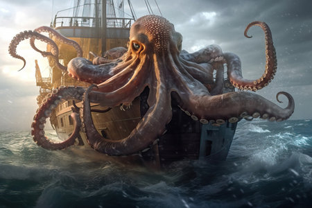 octopus kraken attacking fishing vessel, tentacles wrapping around the boat, created with generative ai