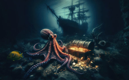 Octopus at the bottom of the sea guards a treasure chest, gold coins.