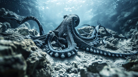 A majestic giant octopus sprawls across the dark ocean floor, its massive tentacles stretching out like ghostly fingers, surrounded by eerie shadows and faint seaweed tendrils.