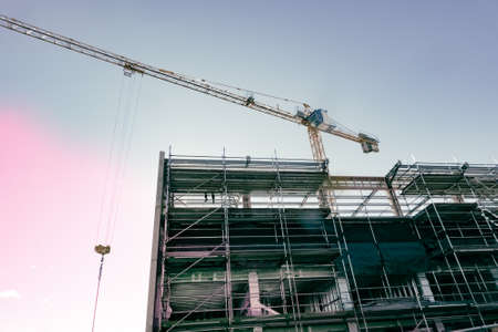 Scaffolding and crane on multistory constructions site with color effects blue and pink.