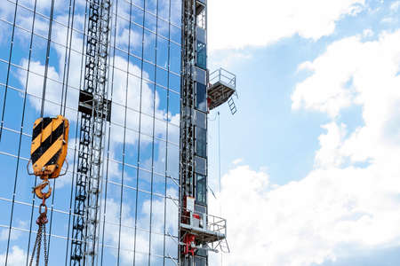 construction of buildings: a crane hook, chains and cables on the background of the sky reflected in the glass