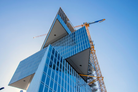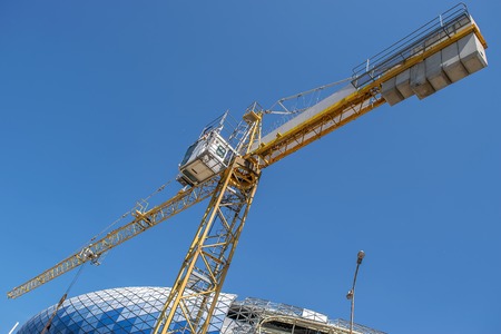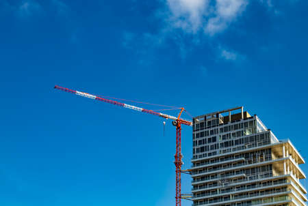 Tel Aviv, Israel - 29 of July 2019: Red and white building crane on the construction of a modern high-rise building at the background of bright blue sky, high-rise building.
