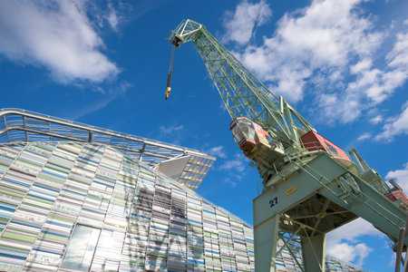 Strasbourg, France - December 28, 2017 - architectural detail of a new district of the city Austerlitz basin with its media library and renovated cranes on a winter day