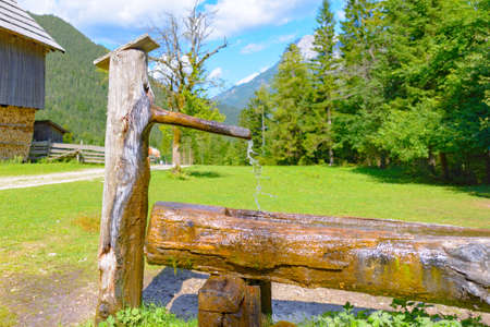 Traditional Wooden water trough, water well with trough in European Alps, Slovenia