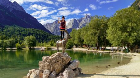Portrait of happy woman over capra ibex on Jasna lake