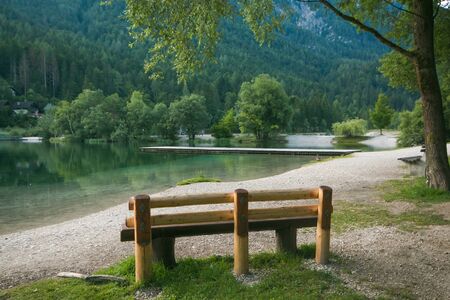 Bench on the shore of a mountain lake with a beautiful landscape during the day.