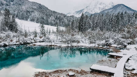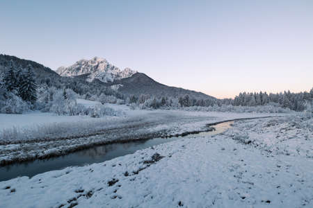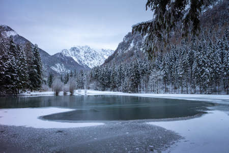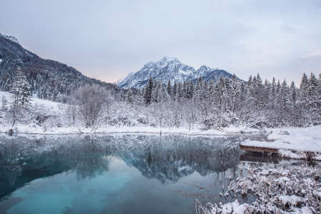 Scenic view of winter landscape with snow covered trees and mountain river in Alps, Slovenia. Beauty of nature concept background.