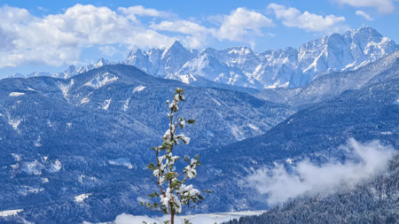 Scenic view of mountain summit Jof di Fuart (Vis) and Jof di Montasio in Julian Alps seen from Kobesnock in Bad Bleiberg, Carinthia, Austria, Europe. Snow covered tree branch in winter wonderland