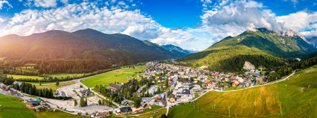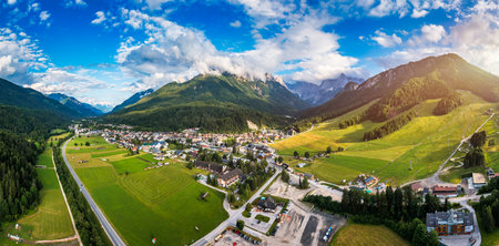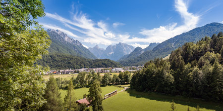 Kranjska Gora town in Slovenia at summer with beautiful nature and mountains in the background. View of mountain landscape next to Kranjska Gora in Slovenia, view from the top the town Kranjska Gora.