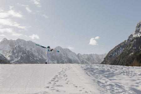 Ski jumper walking across a ski slope, with skis on his shoulder, in the beautiful winter mountain landscape. Ski sports concept.
