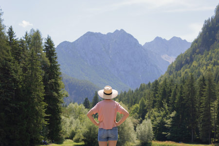 Travel, Freedom, Lifestyle concept. Young woman enjoying green nature outdoors. Amazing view on Zelenci (into English means - green) natural reserve in Slovenia, Europe. People in nature background.