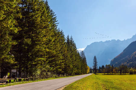 Asphalt road among yellow, green, orange and red autumn trees. Magnificent golden autumn in the mountains. Eastern Europe, Logarska Valley, Slovenia