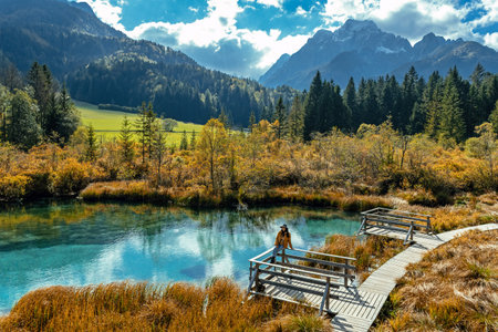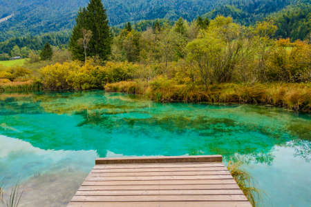 Autumn morning view of Zelenci nature reserve, Slovenia, Europe. Beauty of nature concept background