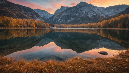 Autumn scenery at lake Jasna, mountain lake in north Slovenia in the Julian Alps.