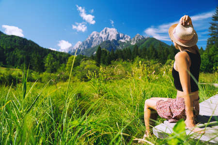 Young woman enjoying freedom on nature outdoors. Travel, Relaxation, Lifestyle Image. Amazing view on Zelenci (into English means - green) natural reserve in Slovenia, Europe. Nature background.