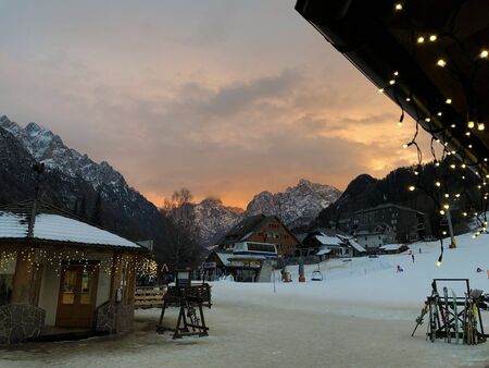 Kranjska Gora town in Slovenia at winter with mountains in the background