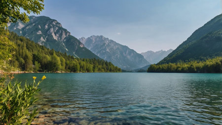 Alpine mountain lake landscape flower panorama reflection at Laghi di Fusine Weissenfelser See in Dolomites alps Italy