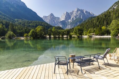 Beautiful nature landscape in Julian Alps. Lake Jasna near Kranjska Gora, Slovenia. Mountains and colorful trees in the background reflected in the crystal clear water. Triglav National Park