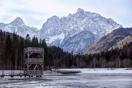 Observation platforms in Zelenci Nature Reserve near Kranjska Gora in north west Slovenia. It is a protected wetland and source of the Sava Dolinka River. The Ponce mountains are in the background