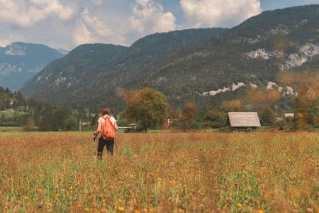 Female hiker is trekking in alpine countryside landscape in sunny autumn midday using hiking poles, selective focus