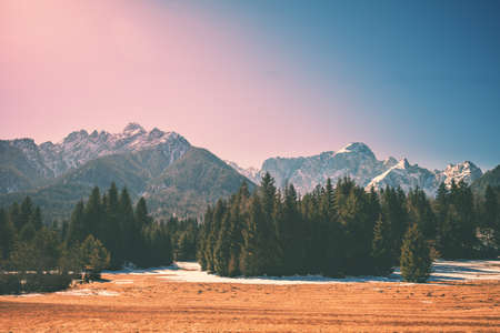 View of Alps in Kranjska Gora at sunrise. The tops of the mountains are covered with snow. Triglav national park. Slovenia, Europe