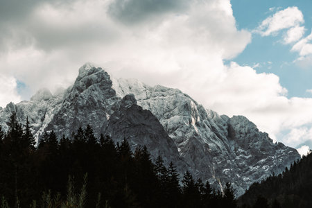 A closeup of a forest against a mountain peak covered with fog and snow in the Julian Alps, Slovenia
