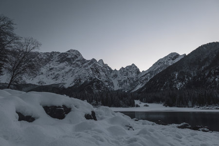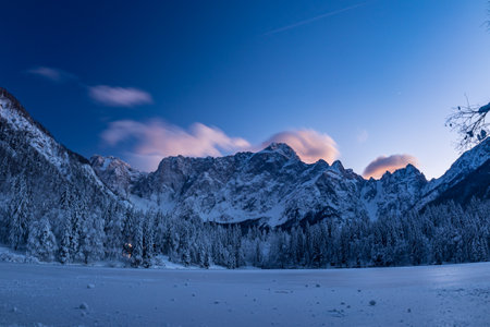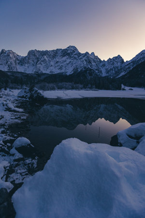 Frosty winter sunset at the lakes of Fusine, Friuli Venezia Giulia, Italy
