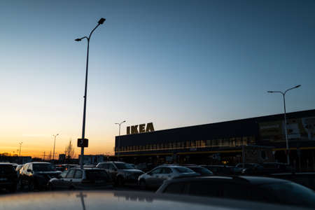 RIGA, LATVIA - APRIL 3, 2019: IKEA brand sign during dark evening and wind - Blue sky in the background