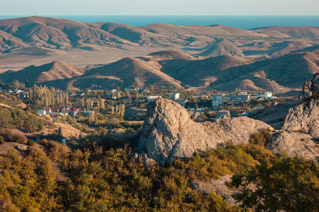 Sunset landscape overlooking the hilly coastal line in Crimea, Koktebel.