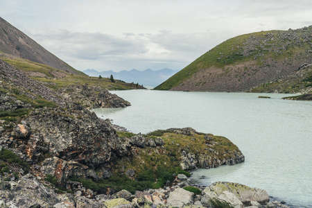 Beautiful view to mountain lake on background of mountains on horizon under cloudy sky. Atmospheric green landscape with lake in high mountain valley. Great scenery with mountain lake in highland glen