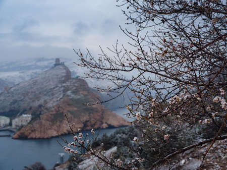 ancient castle ruins on a beautiful rock rise above the sea. winter season, snow is falling.