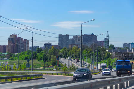 Moscow, Russia, 06.08.2021. Road scenery on a highway at summer time. Kutuzovsky prospect area. The modern life of the big city.