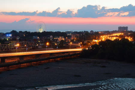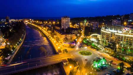 Drone view of Kubanskiy Bridge over Sochi River, buildings and streets of the city of Sochi at dusk, Russia
