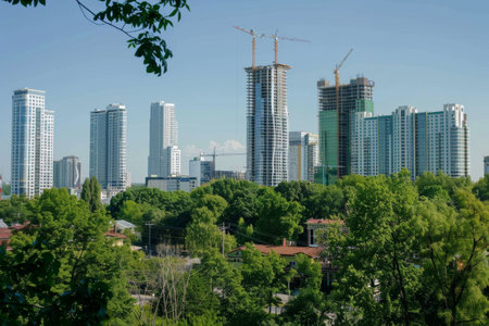 Aerial photography of residential areas of Kyiv with a view of residential areas, green parks and new skyscrapers under construction, city photography. Vertical image. Copy space.