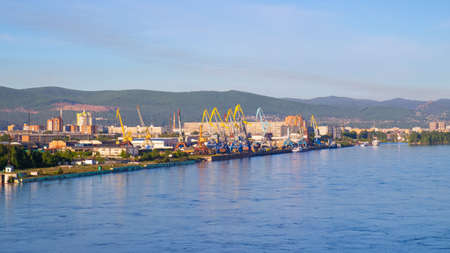Krasnoyarsk, Russia - June 11, 2021: gantry cranes in the river cargo port in Krasnoyarsk, Russia