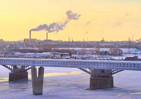 Industrial city on the river in winter against a cloudy sky. City divided by the river.